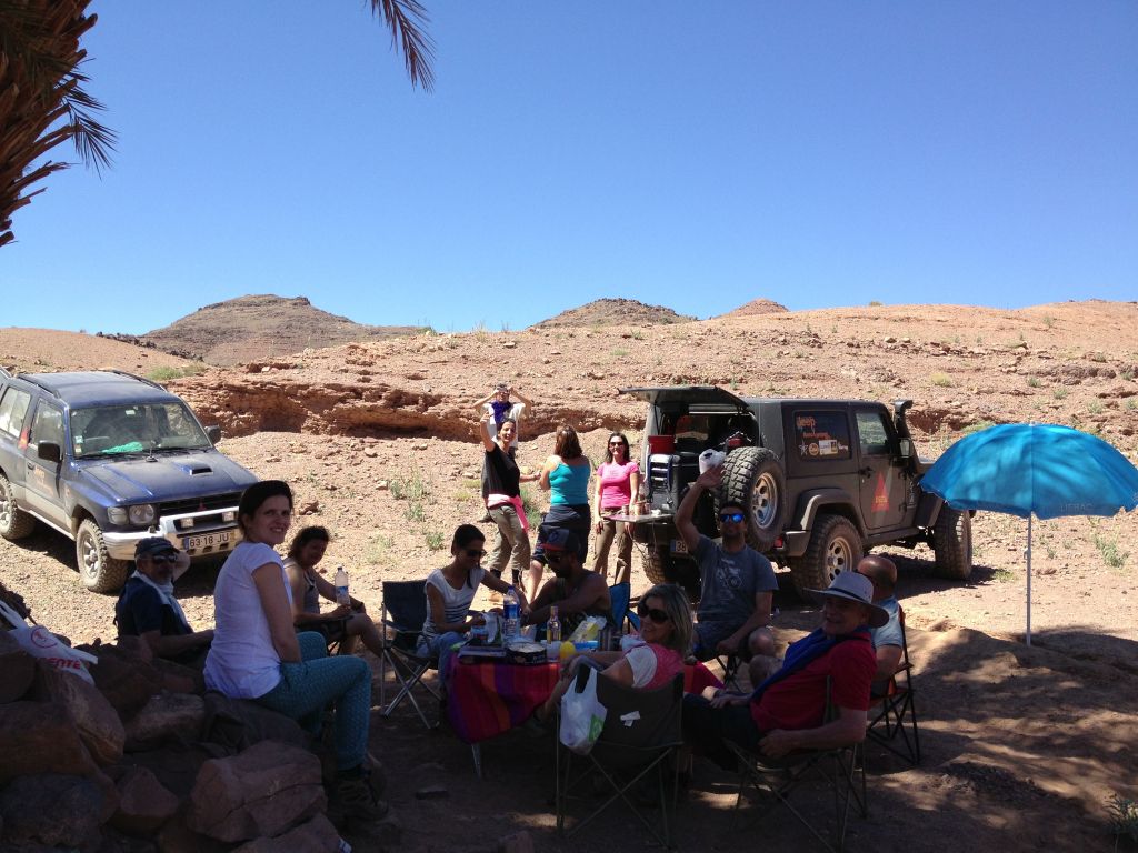 Depois de entrar na pista que, para mim é uma das mais belas que conheço em Marrocos e muito pouco usada neste tipo de expedições, todos tiveram a oportunidade de por à prova a destreza na condução em pista rápida com algumas surpresas pelo meio… Não houve complicações e andámos a muito bom ritmo, com direito a almoço debaixo de uma palmeira que estava reservada para o grupo!